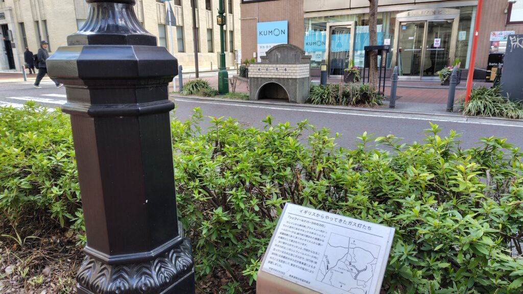 ガス灯の解説、向こう側には「牛馬飲水」