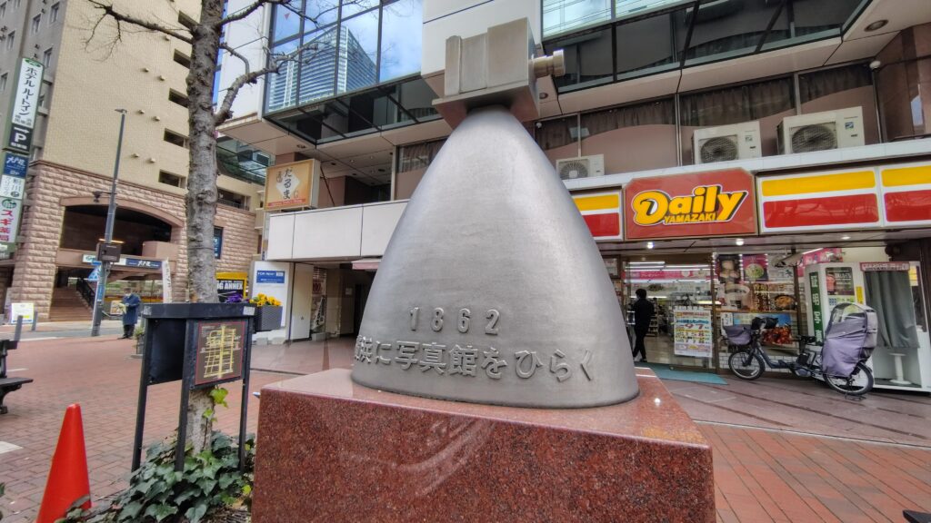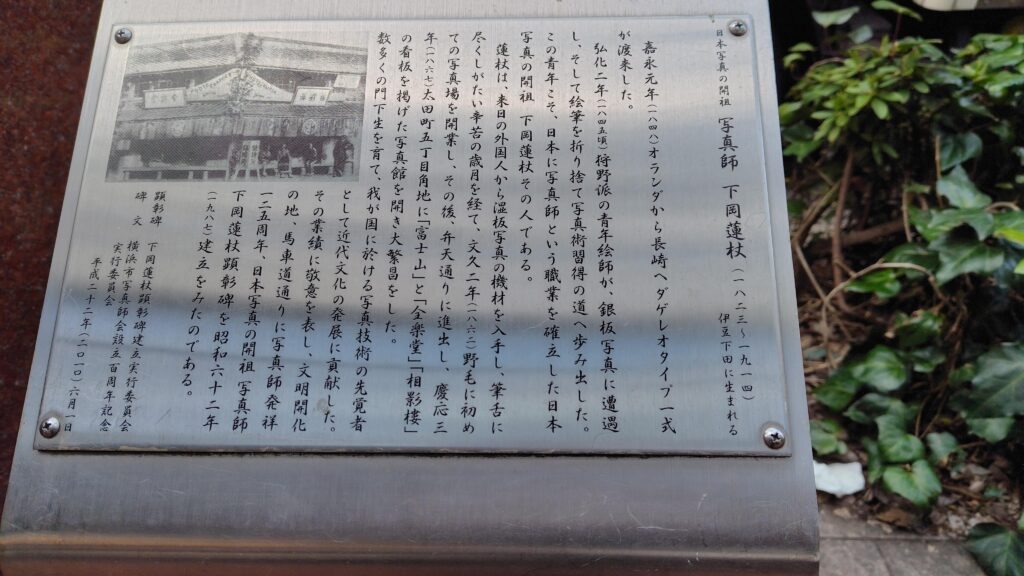 馬車道・弁天通りに設置されている日本写真の開祖、 下岡蓮杖顕彰碑